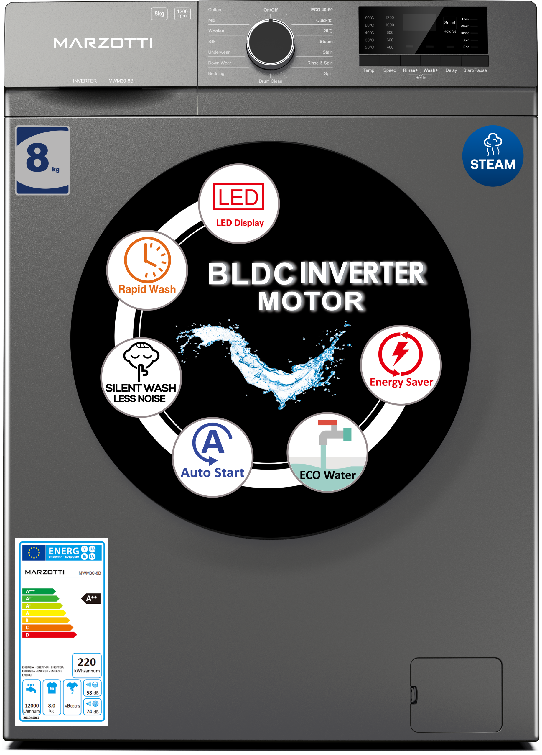 Washing Machine 8KG BLDC Inverter STEAM Energy Saving LED1200rpm SUS430 Low Noise